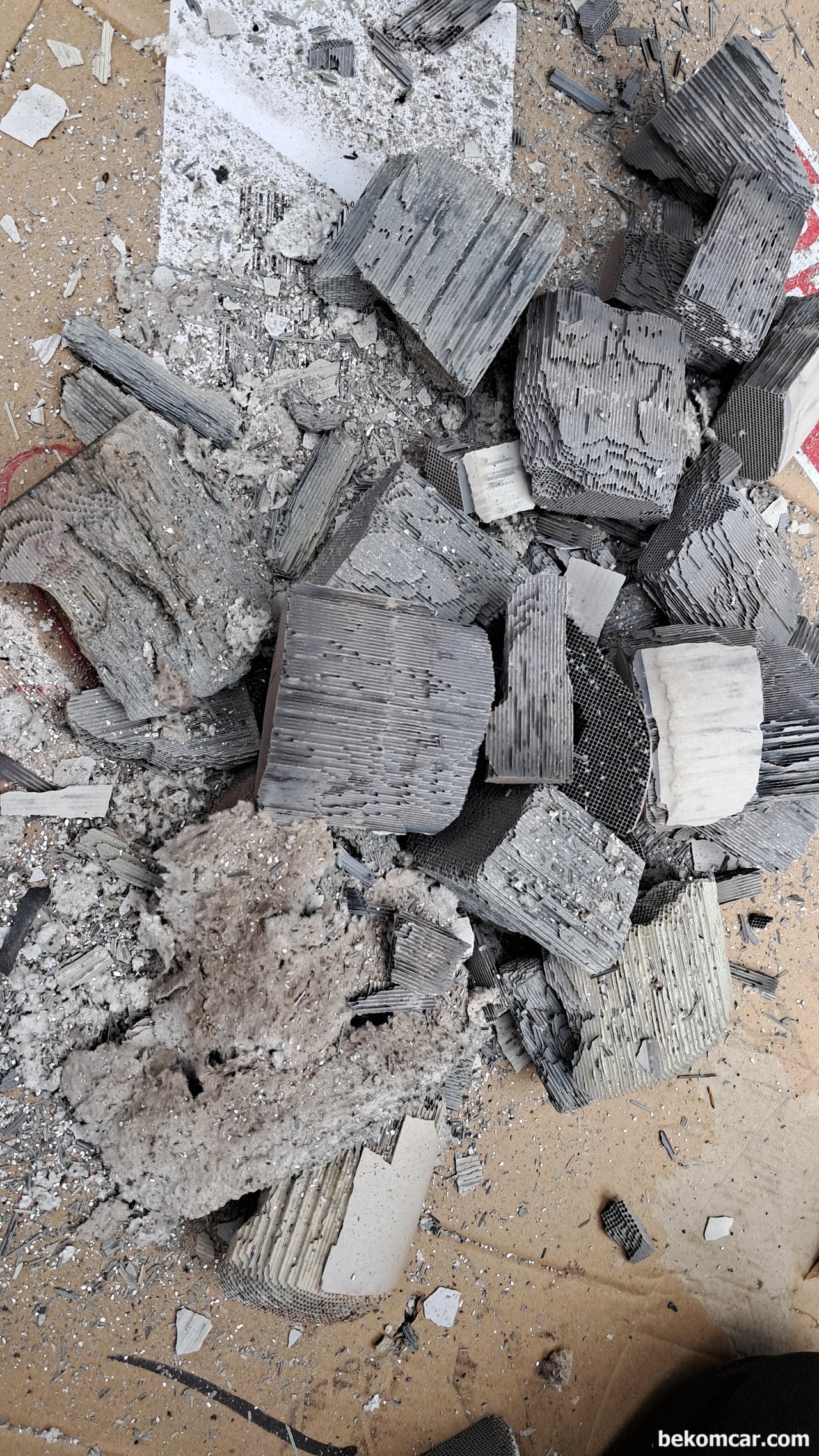 비싼 촉매 손상된 상태이다. 처참하게 망가졌다. 촉매는 대부분 폐차까지 사용할수 있는데 차량관리 잘 못하면 촉매 망가진다. 특히 엔진체크등이 깜박거리면 촉매가 매우 위험하다는 신호이다. 이런경우 정차후 견인해서 정비해야 한다. 원인은 연소불안정 (실화 A등급 포함), 냉각수 오염, 엔진오일 오염등이다.