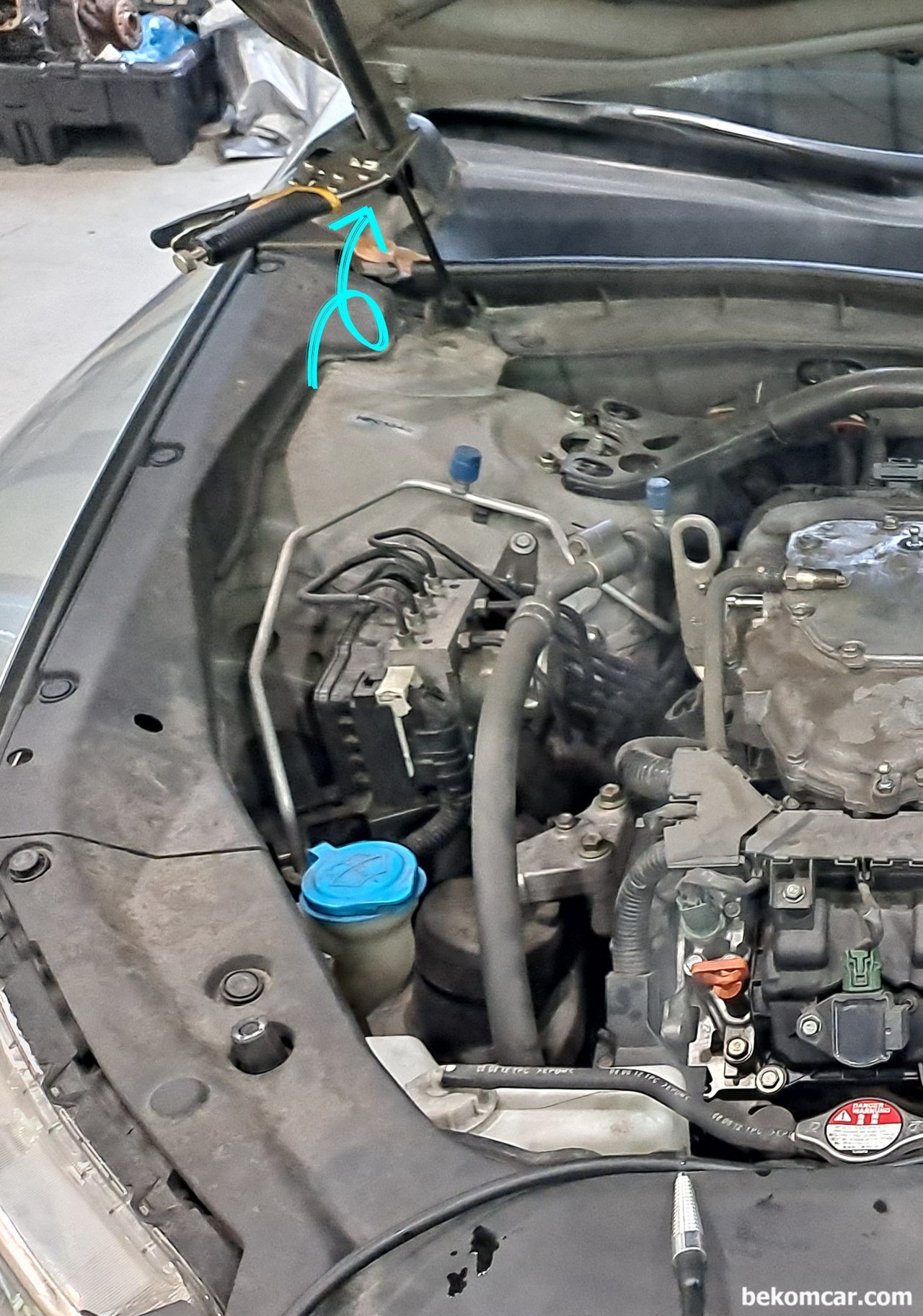 본네트 고정에 바이스 사용. 베콤카 검진중인 혼다 크로스투어 차량이다.