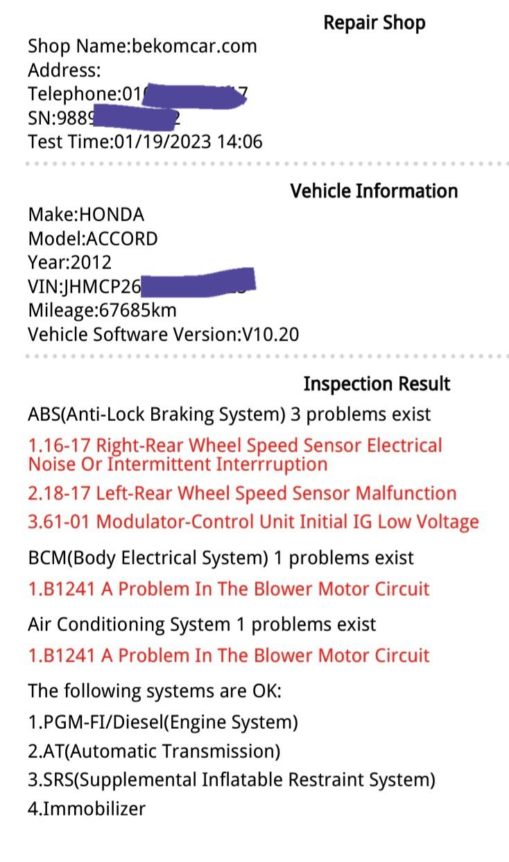 혼다 어코드 8.5세대, 베콤카 SLA1 차량 진단결과 다수의 고장코드가 스캔된다. 고장코드 설명을 고객에게 드린다.