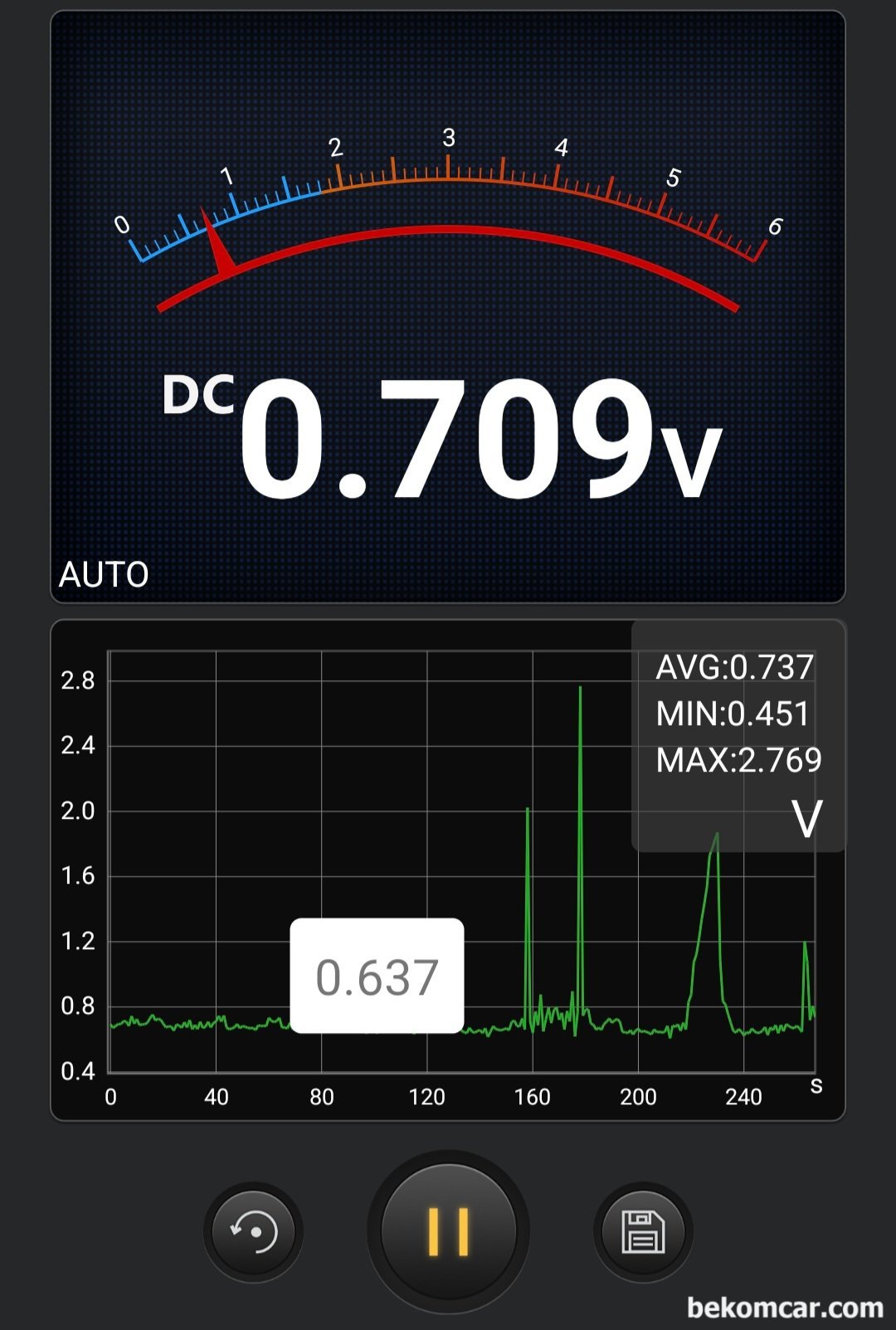 중요한 센서 데이터는 꼭 실제 측정이 필요하다. 진단기 MAF센서 신호전압에 이어, DMM으로 직접 MAF센서 시그널배선에서 측정한다. DMM에서도 매우 낮은값을 보여주고 있다. RPM별 그리고 스냅샷 테스팅(~4.0V이상) 을 해서 MAF센서 상태를 진단한다. 보통은 차량별로 0.70V~4.50V정도이다.