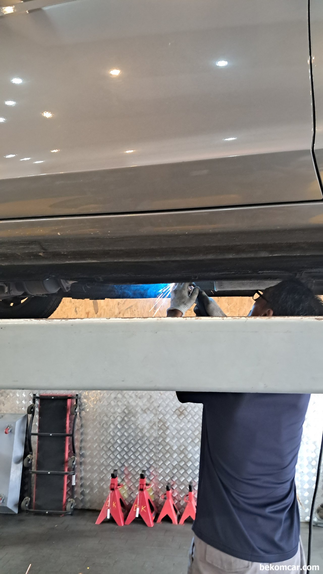 배기 파이프 고정브라켓 장치 용접을 한 다음에 식기전의 모습이다. 용접이 매우 잘 되었다. 잘 못하면 파이프에 구멍나기도 한다. 정비차량은 혼다 어코드 8세대이다.